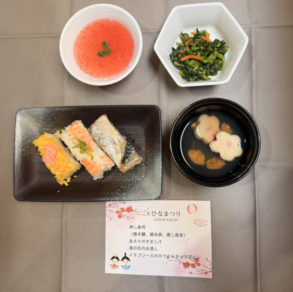 こんにちは、徐々に日も長くなり暖かくなってきましたね。そして明日はひな祭り。本日は一足早くひな祭りの行事食を提供しました。