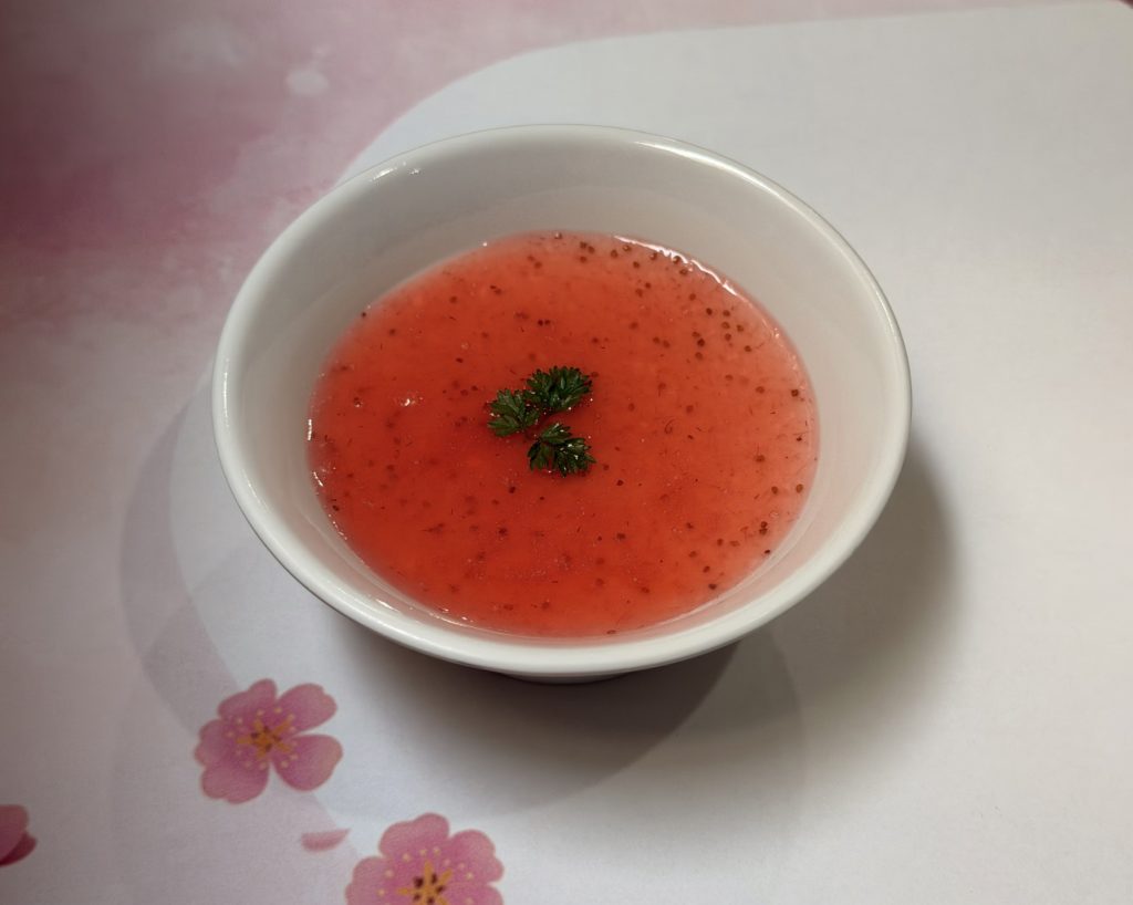 焼き鯖の押し寿司は、しその葉と胡麻を混ぜたご飯で香りがプラスされて贅沢な一品でした。それからデザート♡生のイチゴをミキサーにして、ホワイトチョコのプリンの上にたーっぷりとかけた逸品!プリンの甘さとイチゴの酸味が丁度良くマッチしていました。